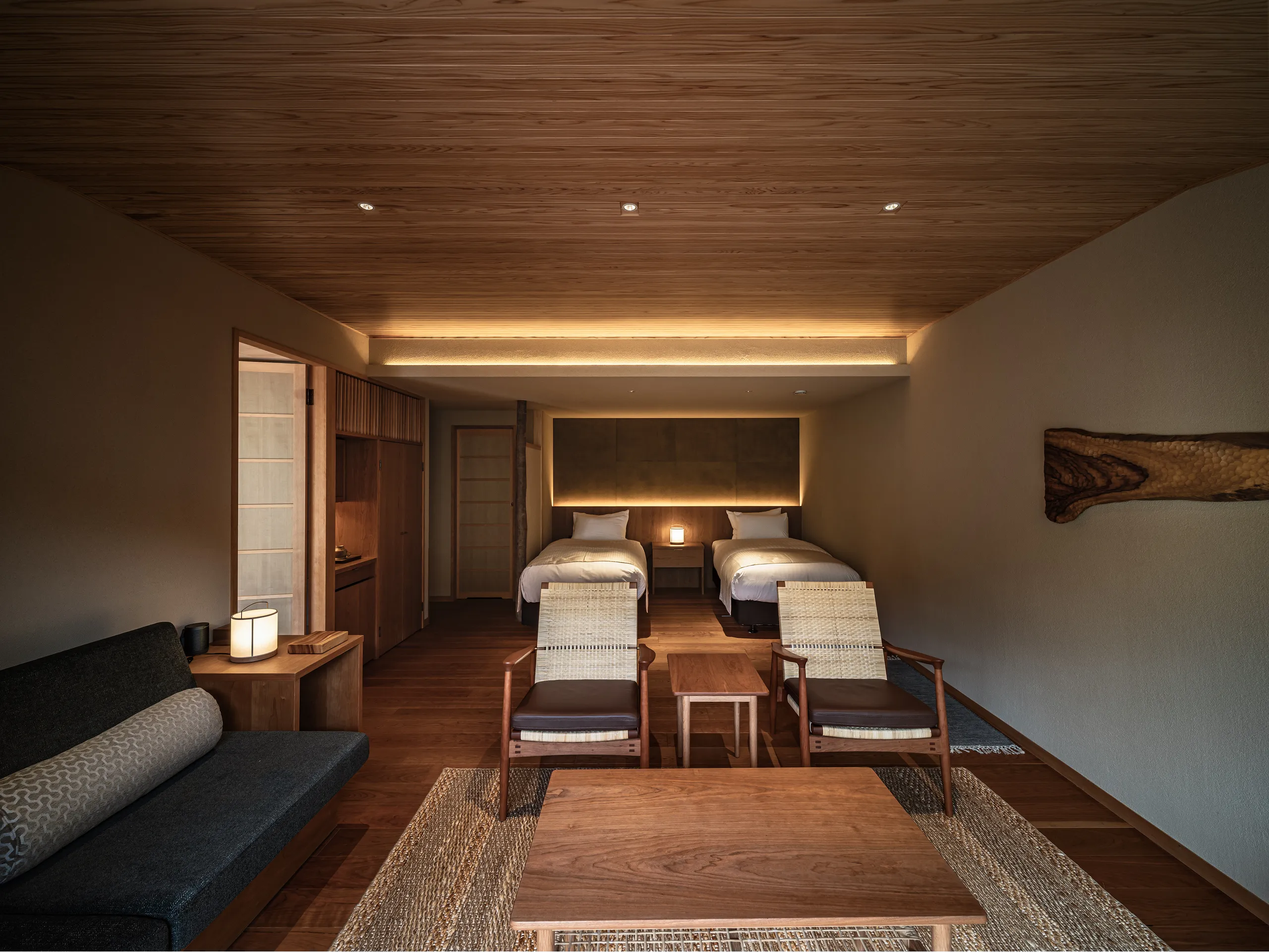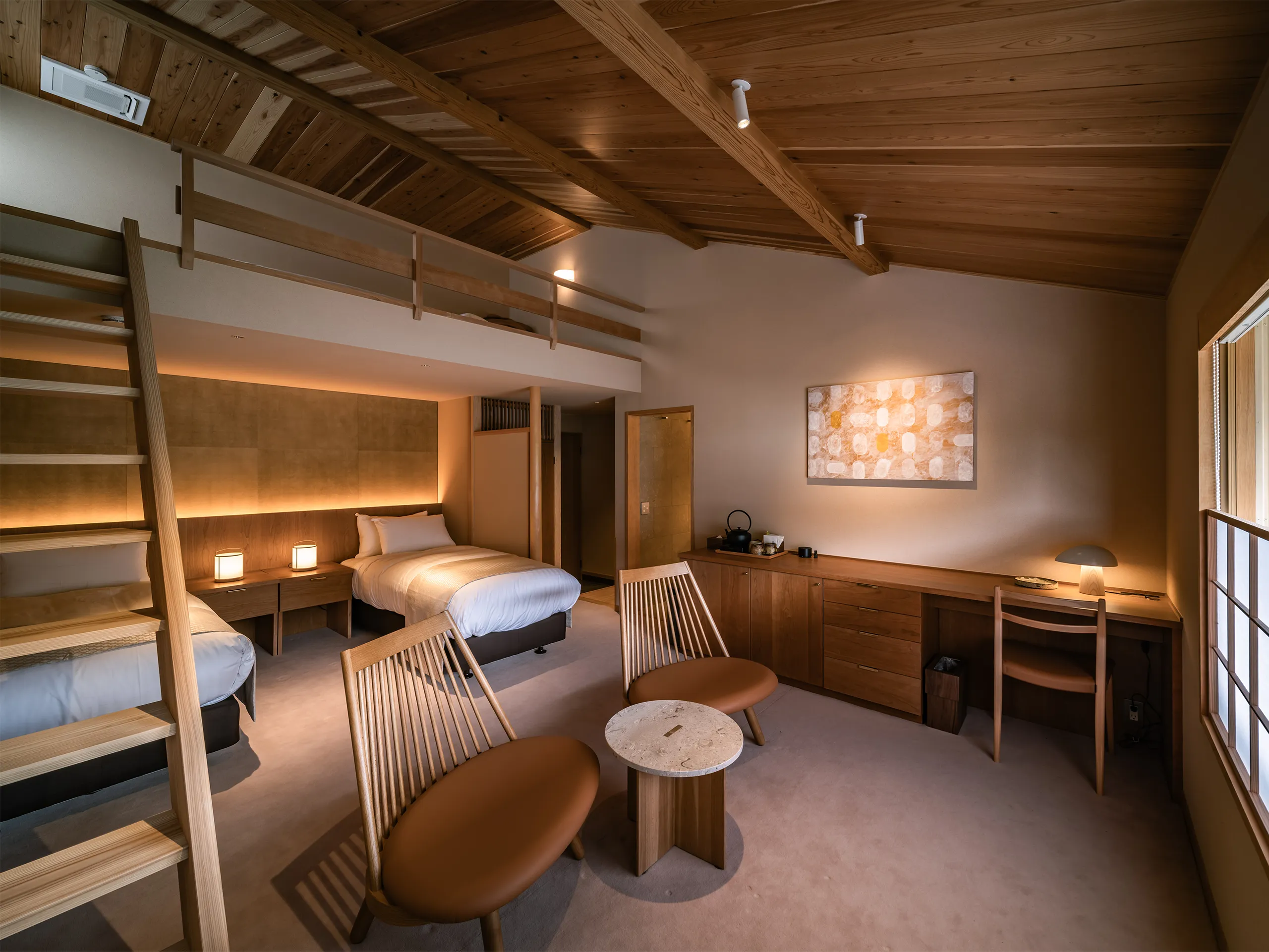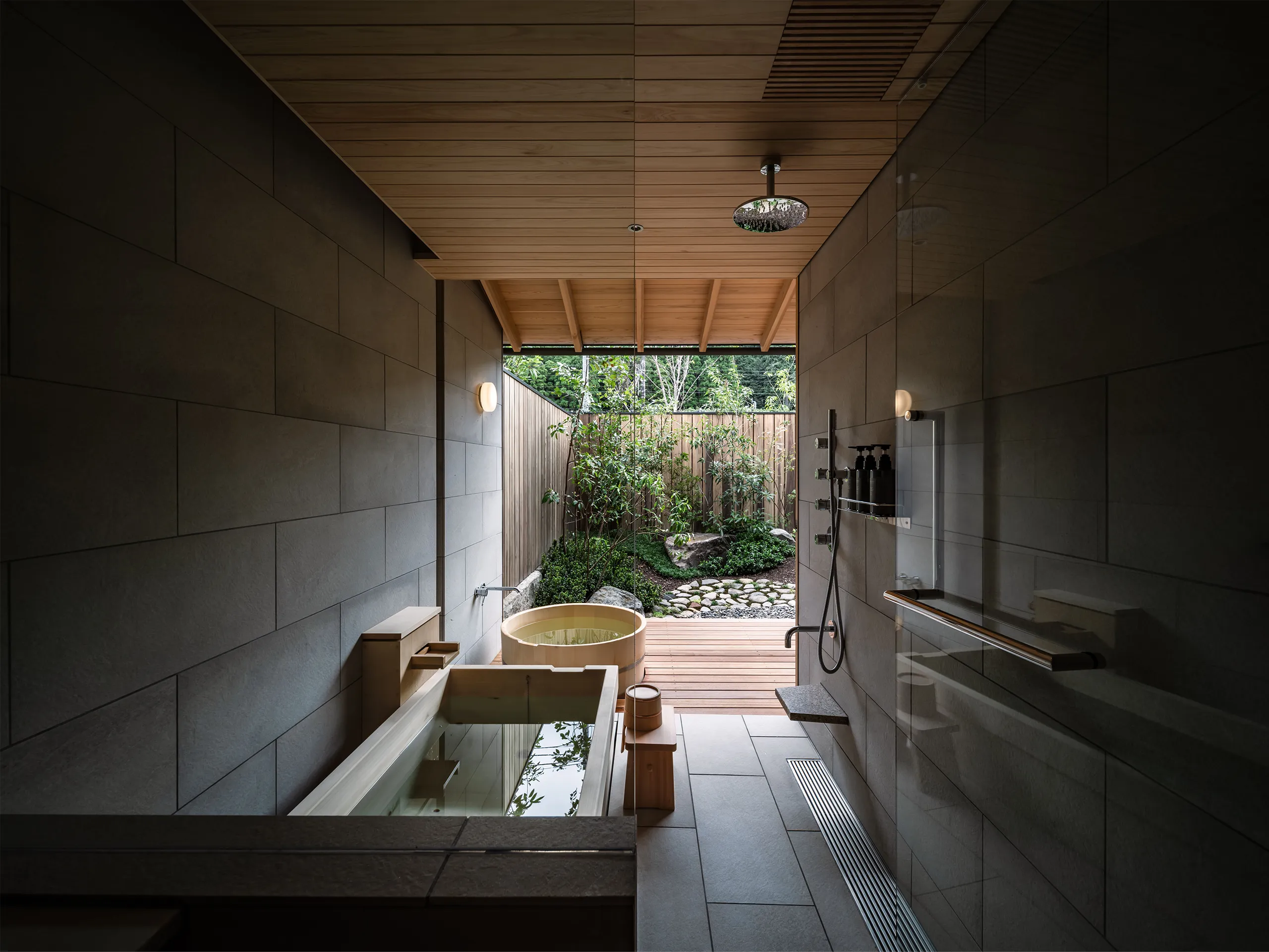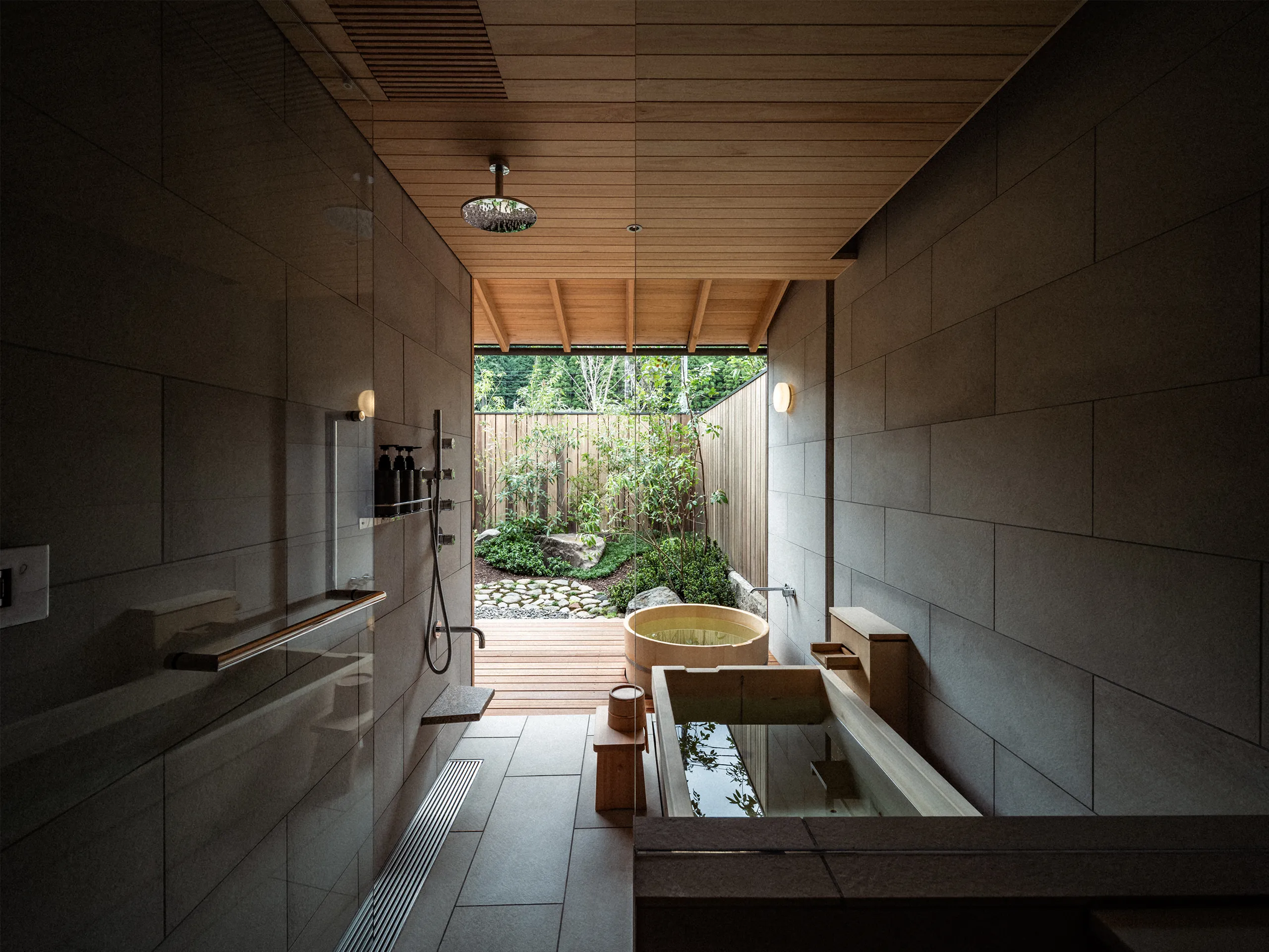 洗面 / シャワーブース / トイレ (ウォシュレット) / Wi-Fi / 冷蔵庫 / 浅型カウンター /ミニテーブル / チェア 2 脚 / ミニバー / 高野薪風呂 / 水風呂 / サウナ / デイベッド /全室禁煙