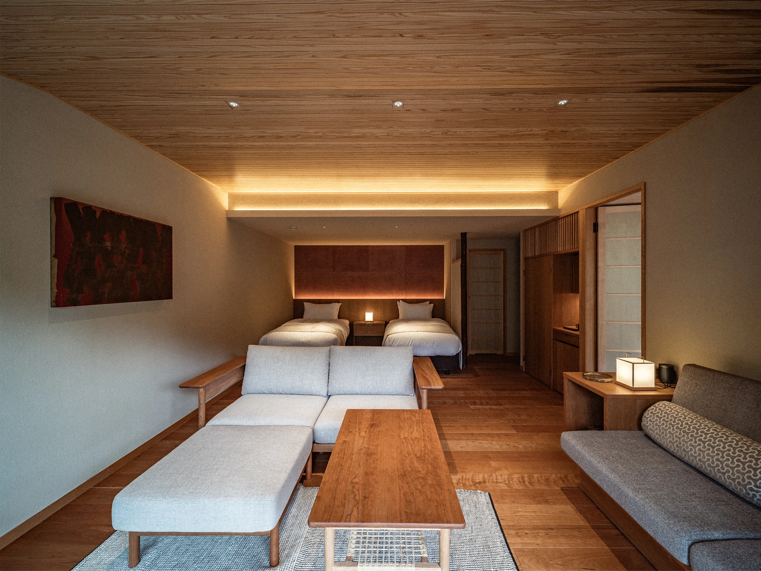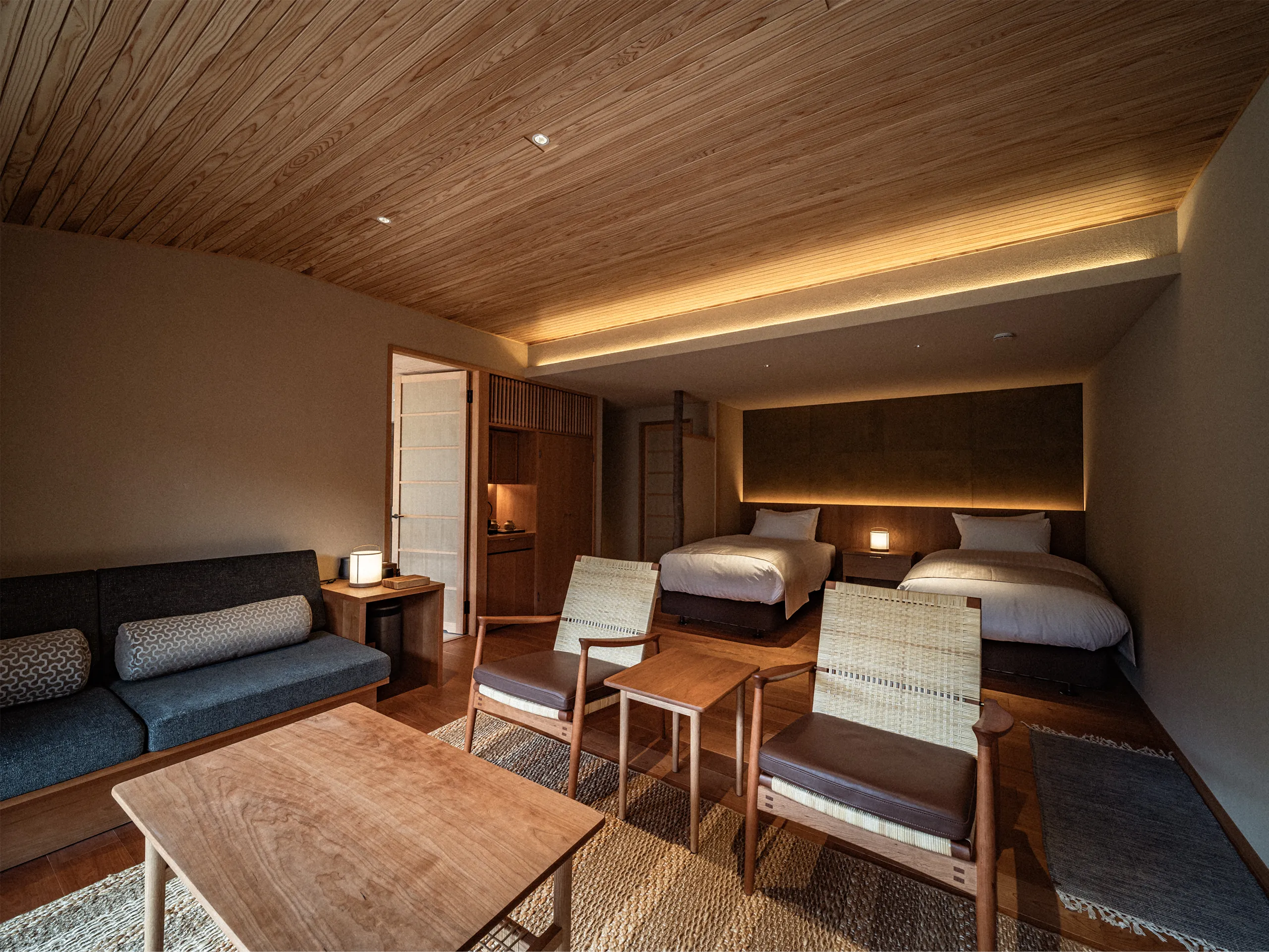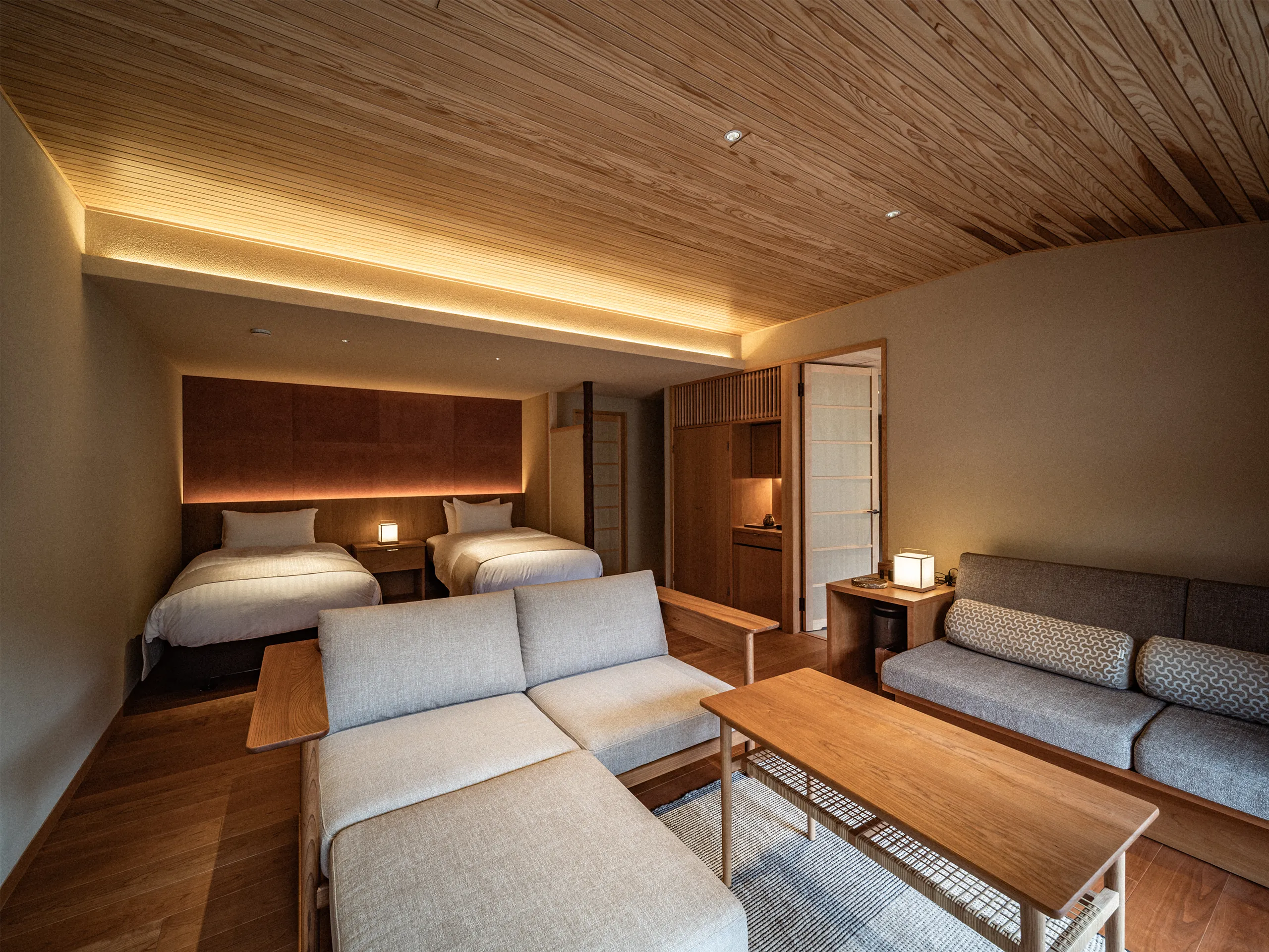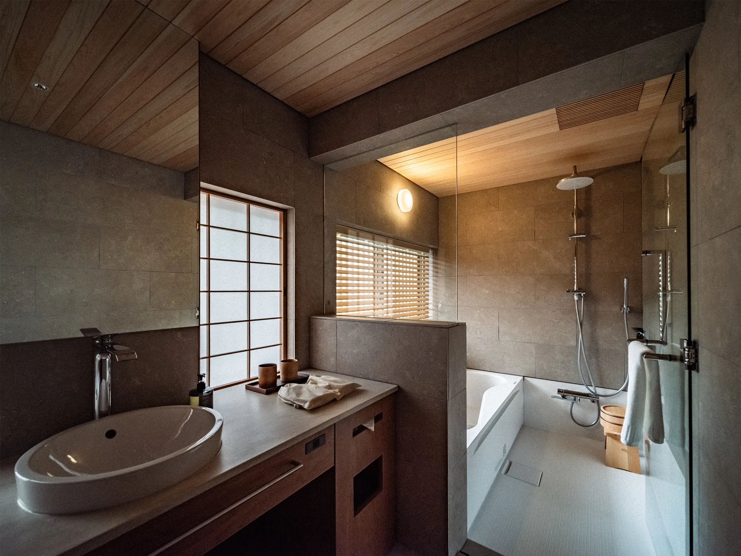 洗面 / シャワーブース / トイレ (ウォシュレット) / Wi-Fi / 冷蔵庫 / 浅型カウンター /ミニテーブル / チェア 2 脚 / ミニバー / 高野薪風呂 / 水風呂 / サウナ / デイベッド /全室禁煙