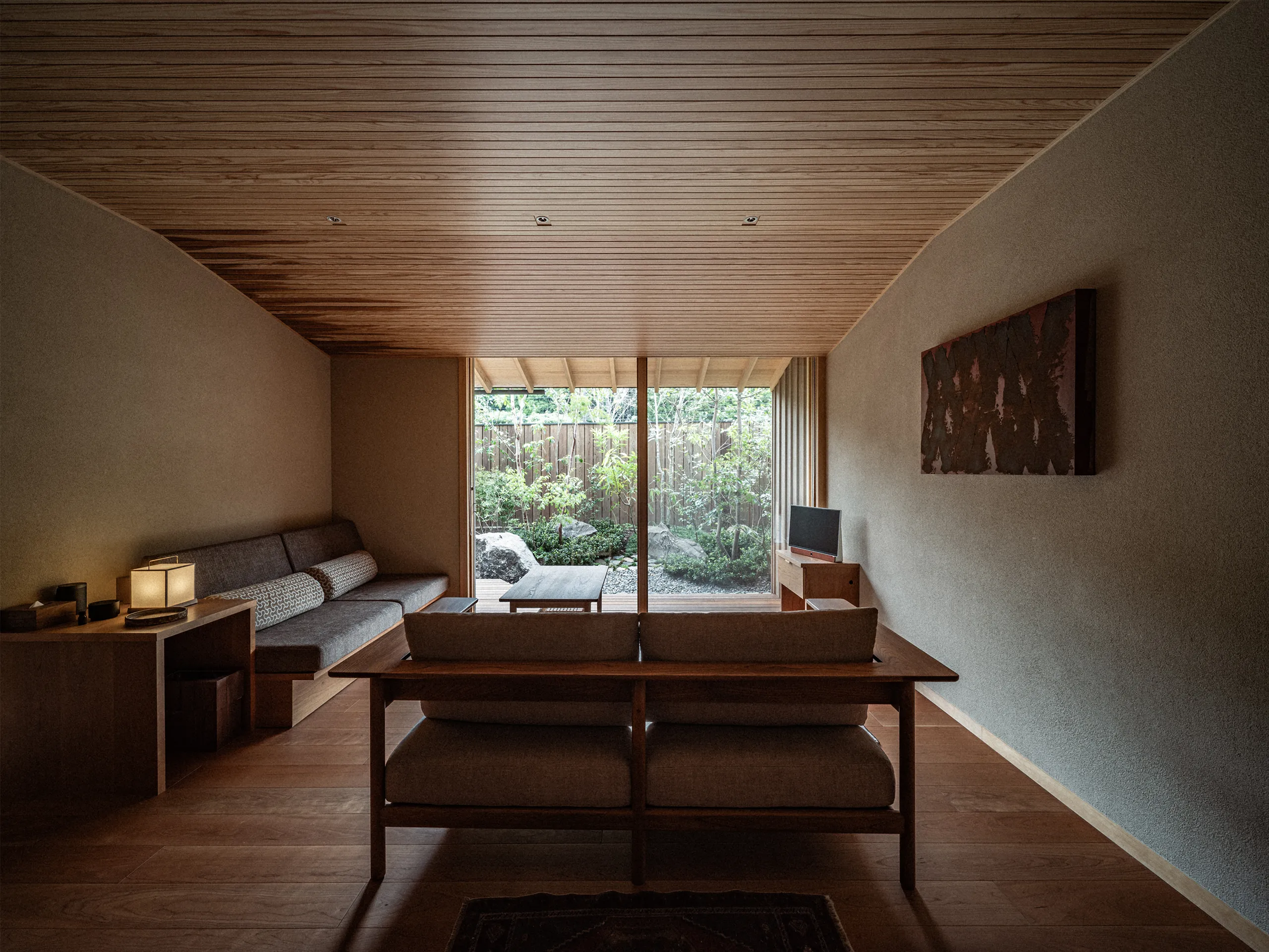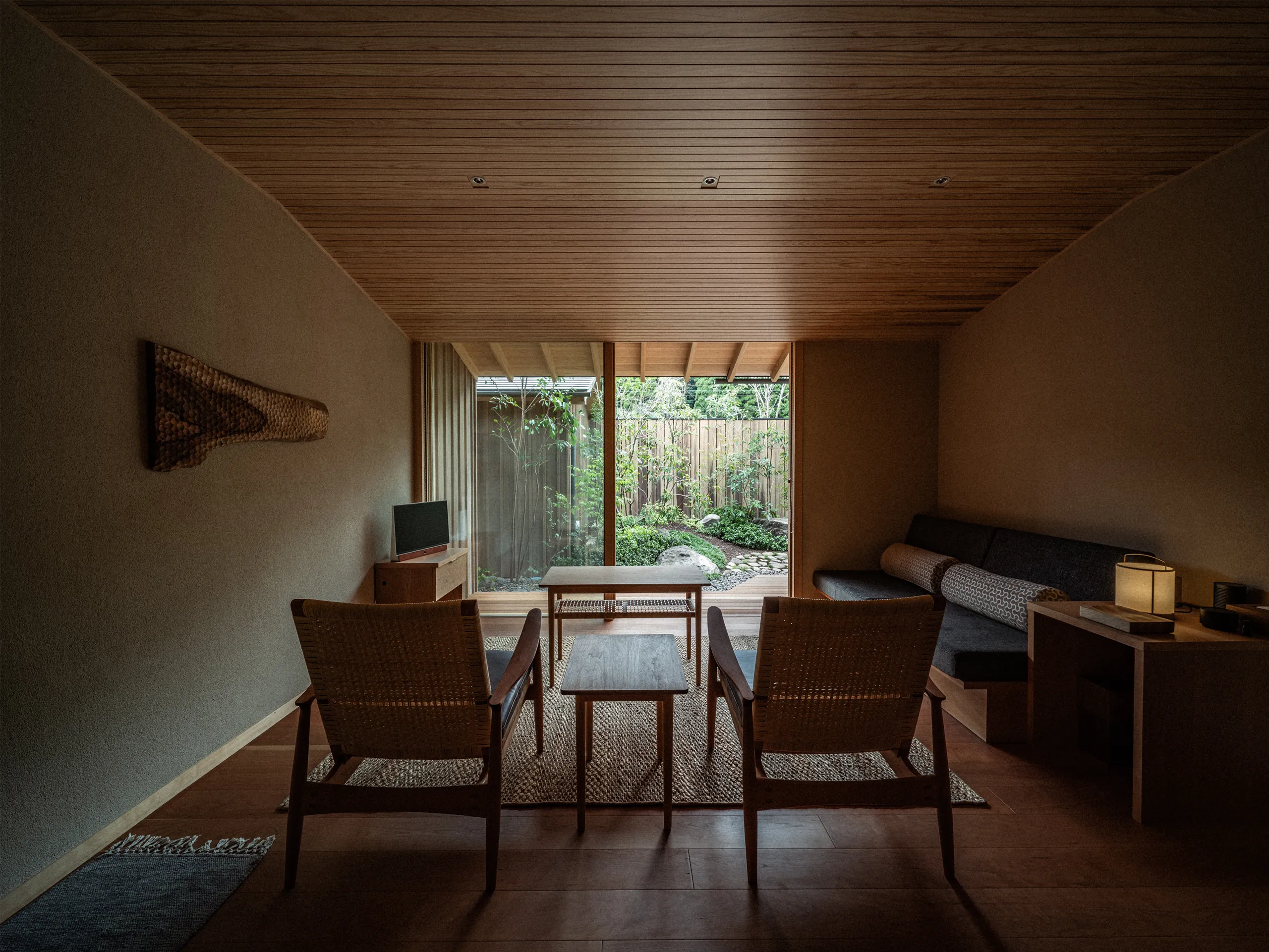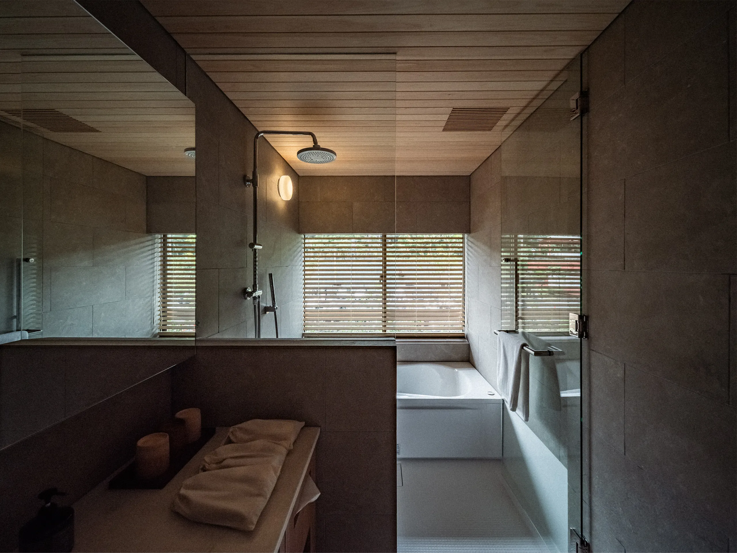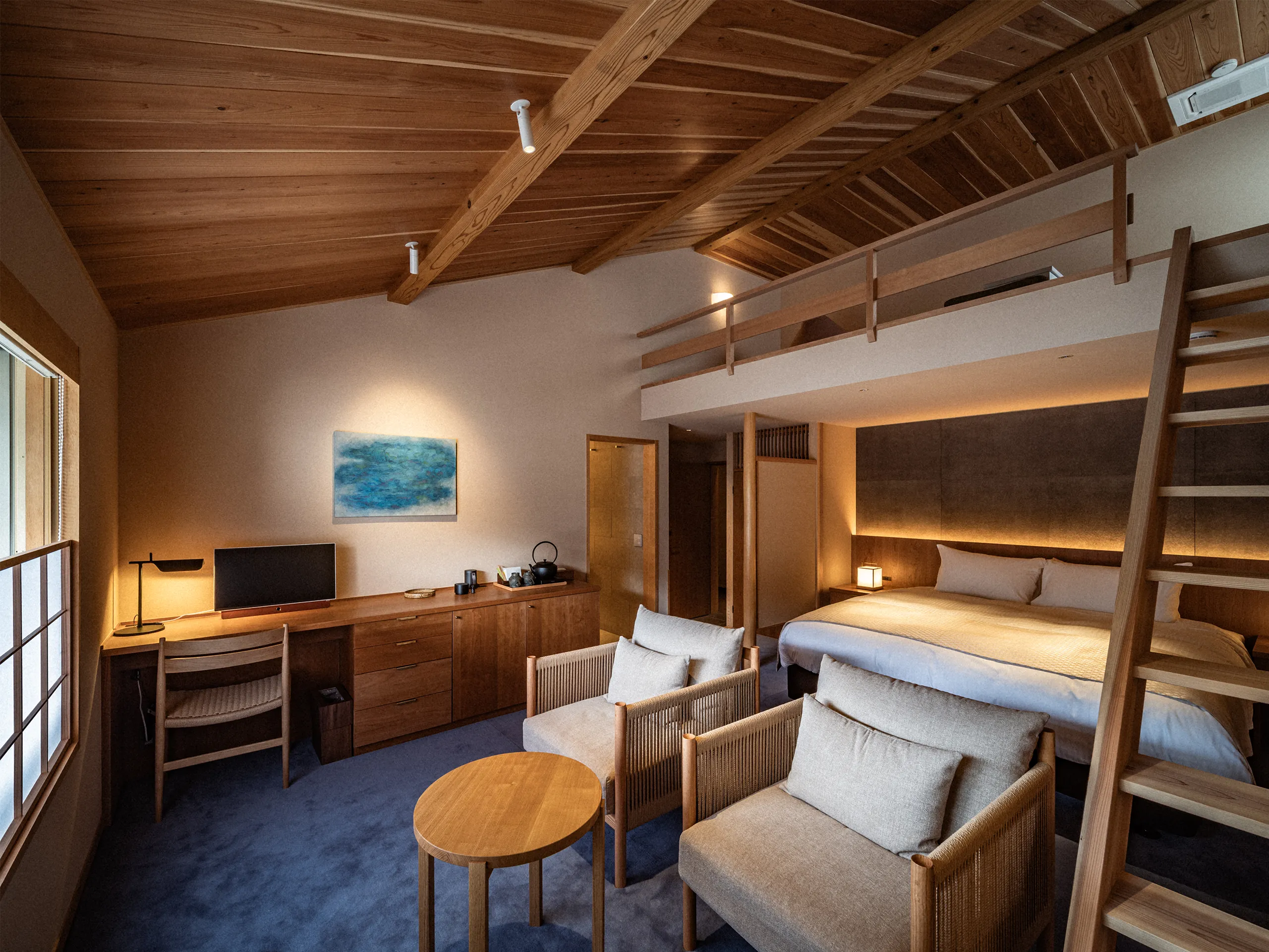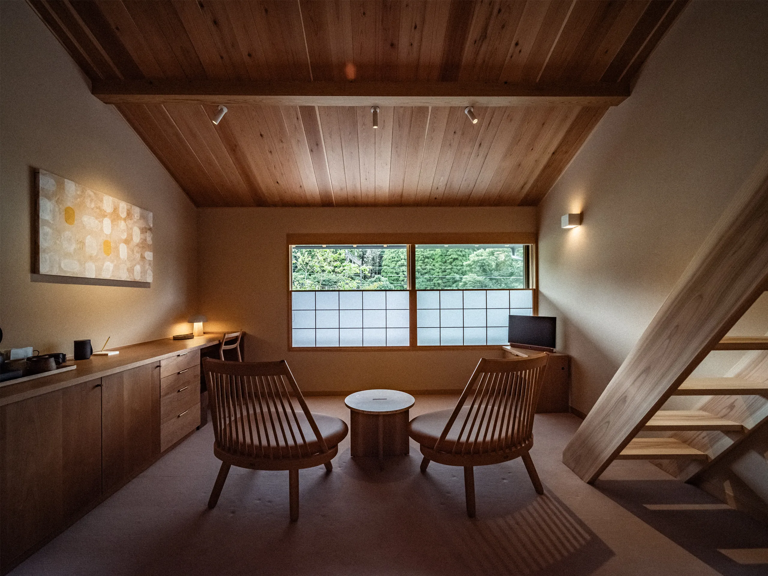 洗面 / シャワーブース / トイレ (ウォシュレット) / Wi-Fi / 冷蔵庫 / 浅型カウンター /ミニテーブル / チェア 2 脚 / ミニバー / 高野薪風呂 / 水風呂 / サウナ / デイベッド /全室禁煙